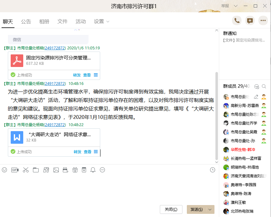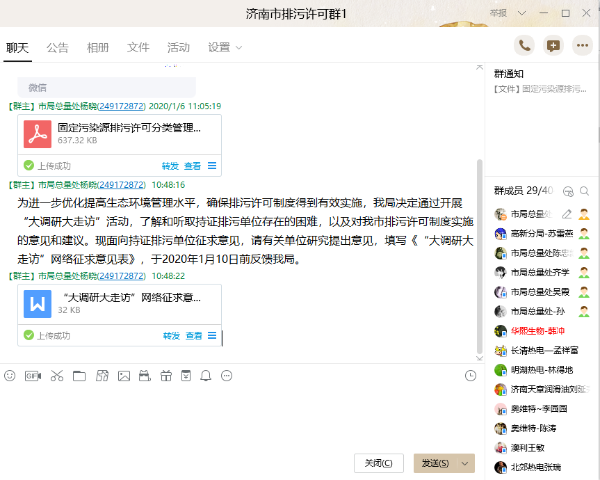 “大调研大走访”采取电话访谈、网络沟通、主动上门3种形式,从已核发排污许可证单位中选取济南达利食品有限公司、平阴山水水泥有限公司等11家单位进行电话访谈;通过在济南市排污许可QQ交流群发送《大调研大走访网络征求意见表》,收集排污单位对我市排污许可工作的意见和建议;选取济南热电有限公司领秀城热源厂、齐鲁制药有限公司等6家单位,主动上门,听取了企业负责人对我市生态环境保护工作和排污许可制度实施的意见和建议。在“大调研大走访”过程中,总量控制处对排污单位在排污许可证执行过程中存在的问题及困难进行了解答,并解读了国家排污许可有关法律法规及政策。