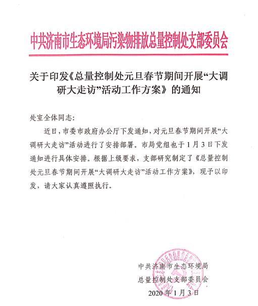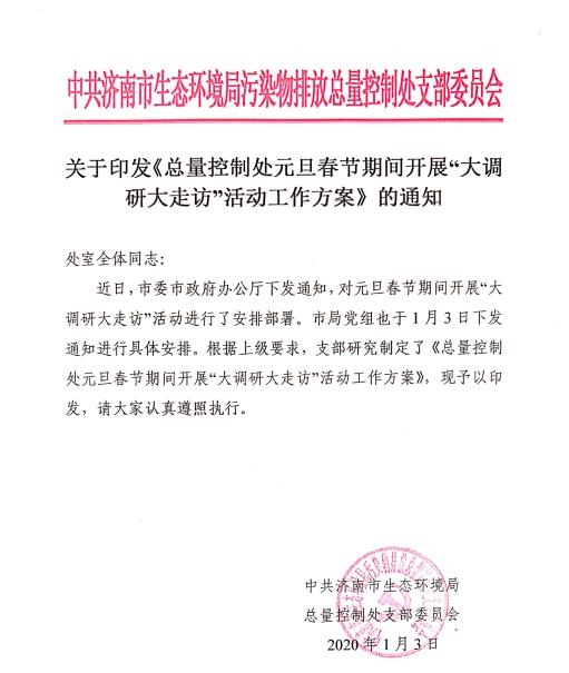 为贯彻落实市委市政府办公厅和局党组关于元旦春节期间开展“大调研大走访”活动的通知要求,总量控制处党支部结合工作实际,制定了《总量控制处党支部元旦春节期间开展“大调研大走访”活动工作方案》,并按要求开展了“大调研大走访”活动。