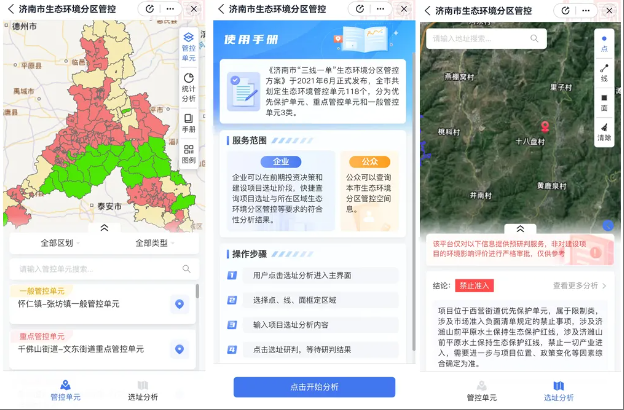 为让生态环境服务更贴近企业群众,济南积极研发“济南市生态环境分区管控空间分析”小程序,在“爱山东”APP上线生态环境规划管控系统公众版,集成三大便民功能:选址风险“三色信号灯”,以红、黄、绿三色预警直观提示风险;生态环境“智能导览”,供企业自助查询指引;环保“数字顾问”,提供电话答疑服务。三大功能让企业群众畅享高效便捷服务,真正实现生态环境服务“指尖可达”。