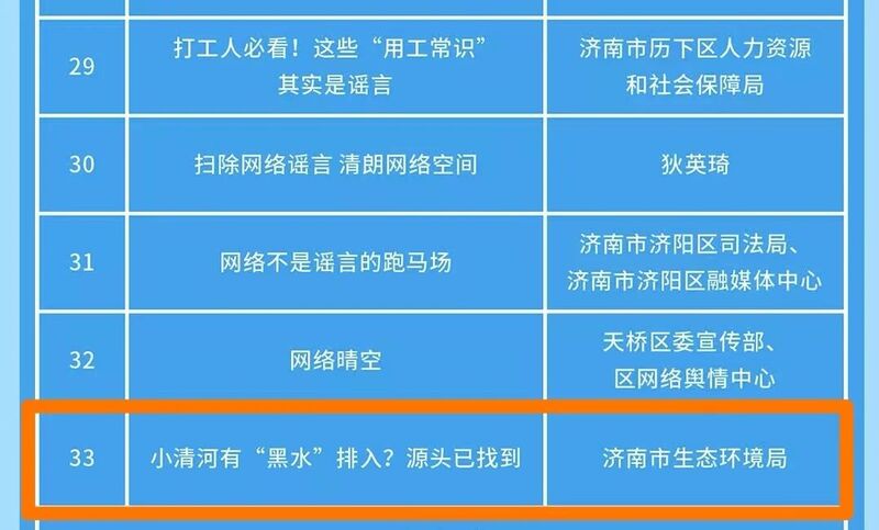 近日,济南市委网信办公布 2025 年度济南市网络辟谣作品征集活动评选结果,济南市生态环境局创作的《小清河有 “黑水” 排入?源头已找到》作品成功入选,获评音视频类典型作品。