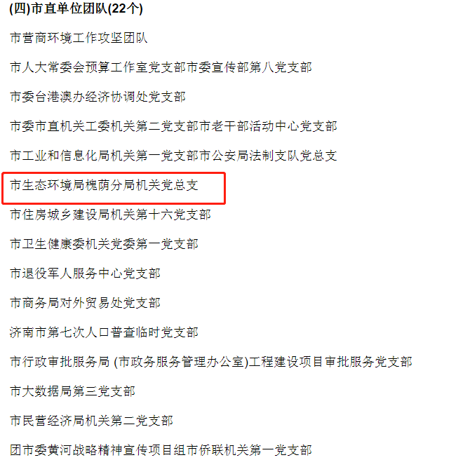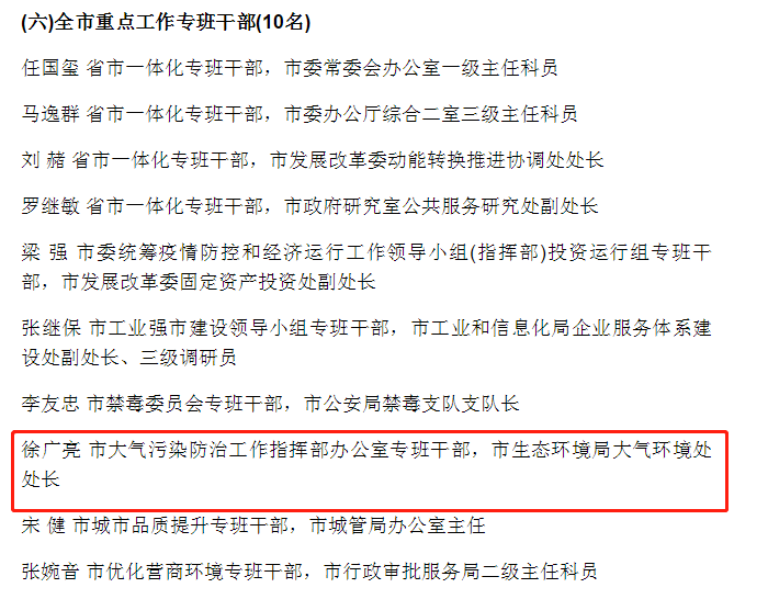 市生态环境局市大气污染防治工作指挥部办公室专班干部,市生态环境局大气环境处处长徐广亮荣获“全市担当作为‘出彩型’好干部”称号;市生态环境局槐荫分局机关党总支荣获 “全市担当作为 ‘出彩型’好团队”称号。