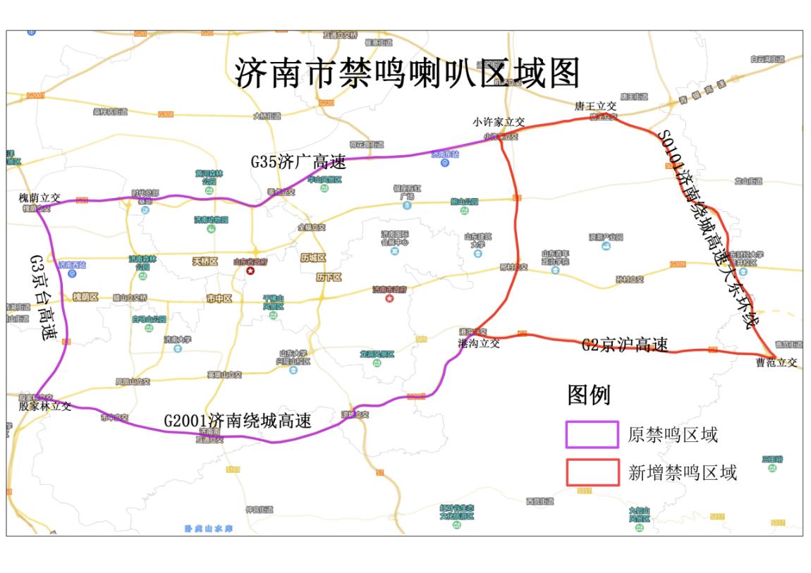 第一部分优化调整了禁鸣区域,由原绕城高速以内区域向东扩大到济南绕城高速大东环线以内区域。即:西起G3京台高速公路殷家林立交至槐荫立交段,东至S0101济南绕城高速大东环线曹范立交至唐王立交段,南起G2001济南绕城高速公路殷家林立交至港沟立交段-G2京沪高速公路港沟立交至曹范立交段,北至G35济广高速公路槐荫立交至唐王立交段(以上高速公路不含)以内区域。